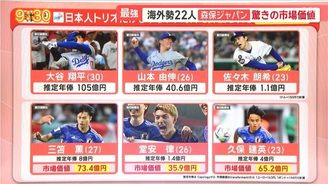 【悲報】テレビ「サッカー日本代表はドジャーストリオにも負けないくらいの価値です!(小さく年俸表記)」