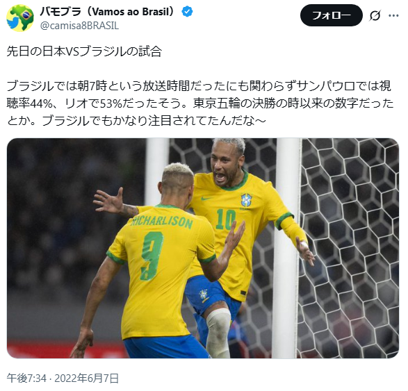 【悲報】ブラジルサッカー連盟のTwitter、日本vsブラジル戦···