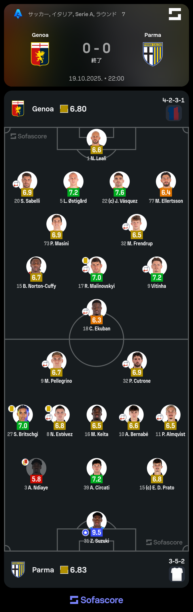 【朗報】パルマGK鈴木彩艶さん、ジェノア戦の採点がヤバすぎるww···